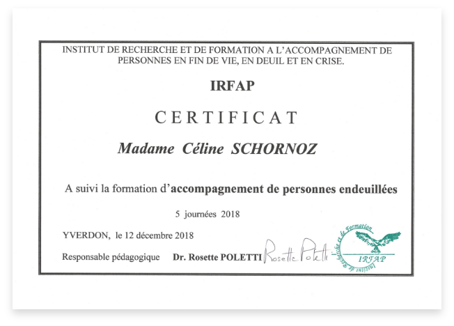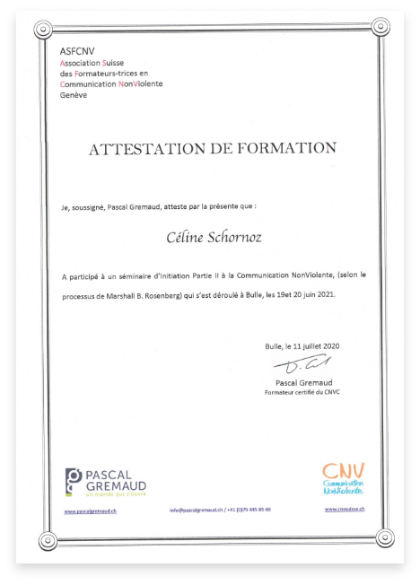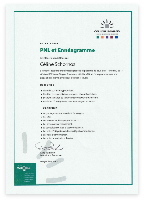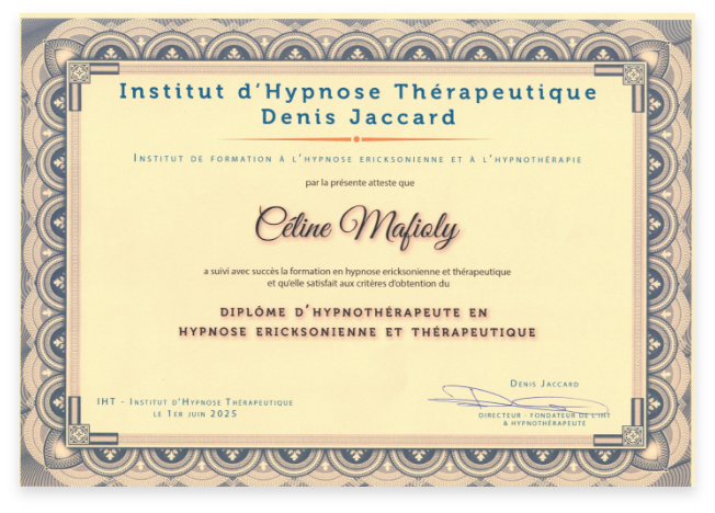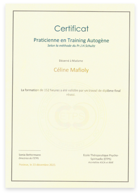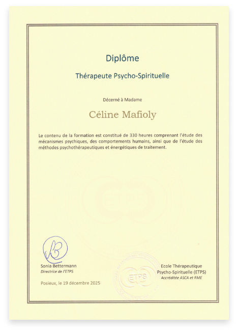 Je suis praticienne certifiée en régulation émotionnelle, hypnose ericksonienne, psycho-spiritualité et training autogène. Je travaille également avec des outils tels que la PNL, la communication non violente, l’EFT et l’accompagnement du deuil. En parallèle, je poursuis un Bachelor en Psychologie appliquée et j’enseigne le Yoga.